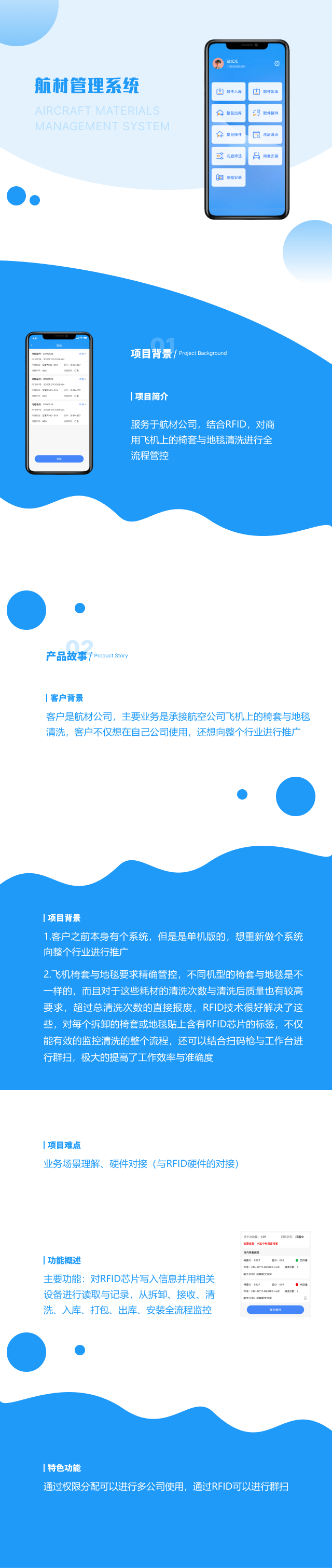 二、项目简介:服务于航材公司,结合RFID,对商用飞机上的椅套与地毯清洗进行全流程管控